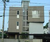 幹線道路に面した鉄骨造の二世帯住宅です。どっしりとした基部、光を受けて上へと向かう階段室、磁北へ向けて角度を振る老人階の三要素からなります。