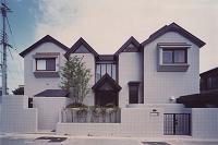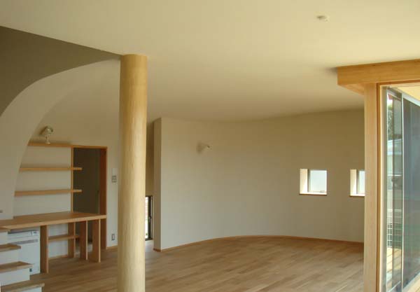まだ勤めていたころ最初に手がけたかわいい住宅です。外壁は表情のあるスタッコ調の吹き付け、リビングとダイニングの間は床のレベルを変化させています。